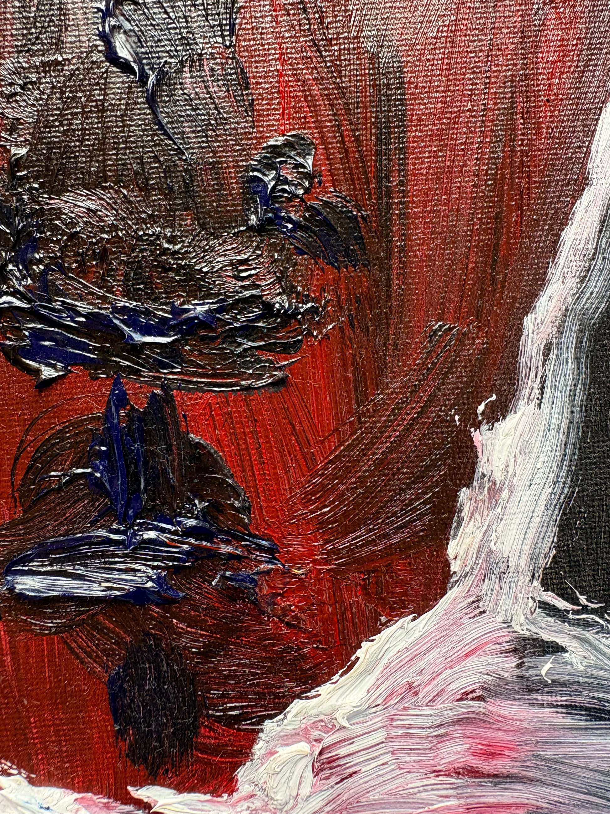 The deep red breathes life into the silence, while the textures speak of transformation—layered and complex, yet light in spirit. It is a bridge to my inner world, a totem of solitude that embraces change and radiates presence. In a space, it is both companion and question, an intimate force that turns stillness into energy.